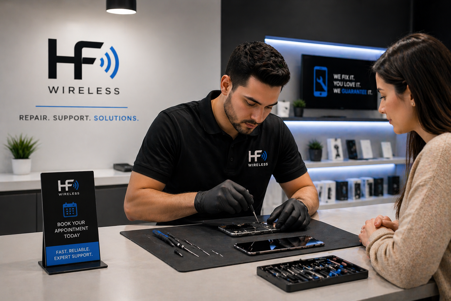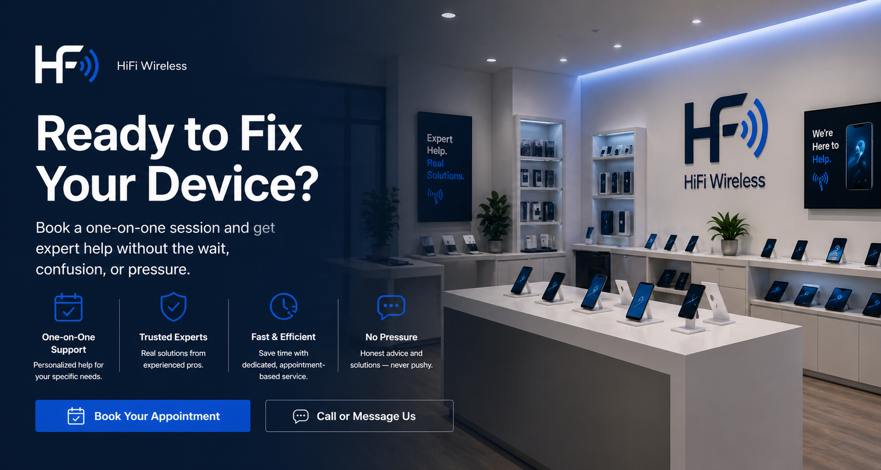 From cracked screens to software issues, HiFi Wireless provides expert device repair and hands-on tech support you can trust. Skip the confusion and long wait times—book an appointment and get personalized help from a real expert, right when you need it.